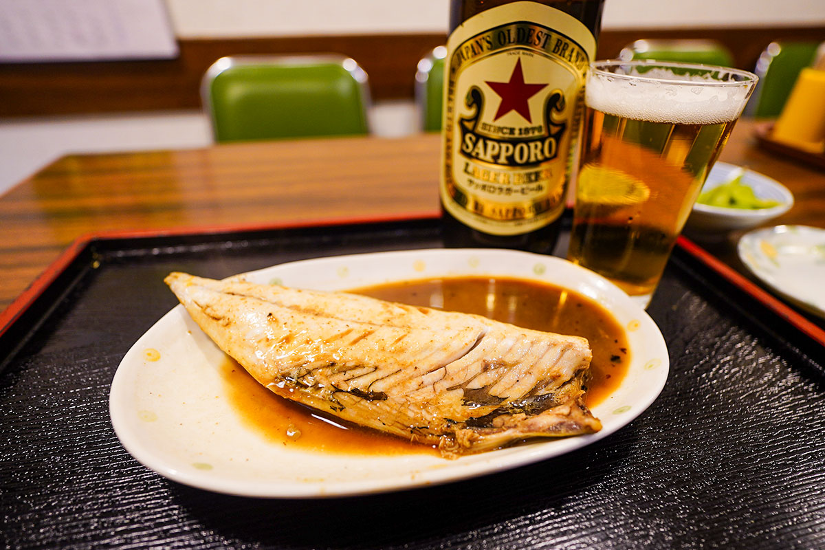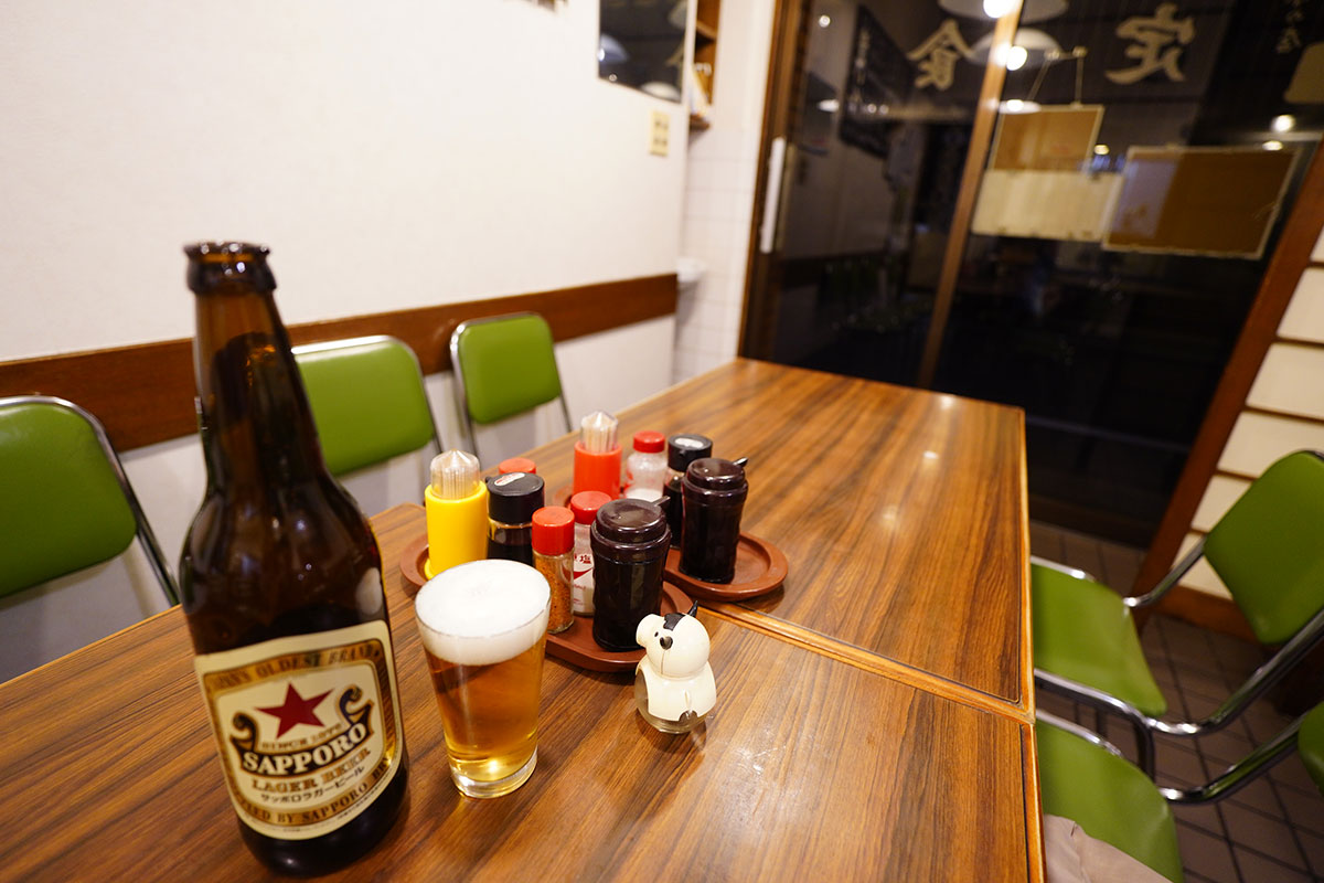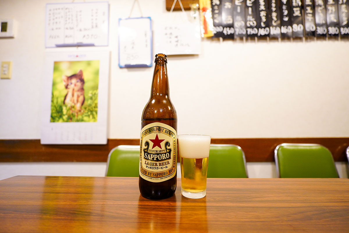 まずは赤星(サッポロラガービール)をもらって、喉を潤します。老舗食堂には赤星が似合いますね!