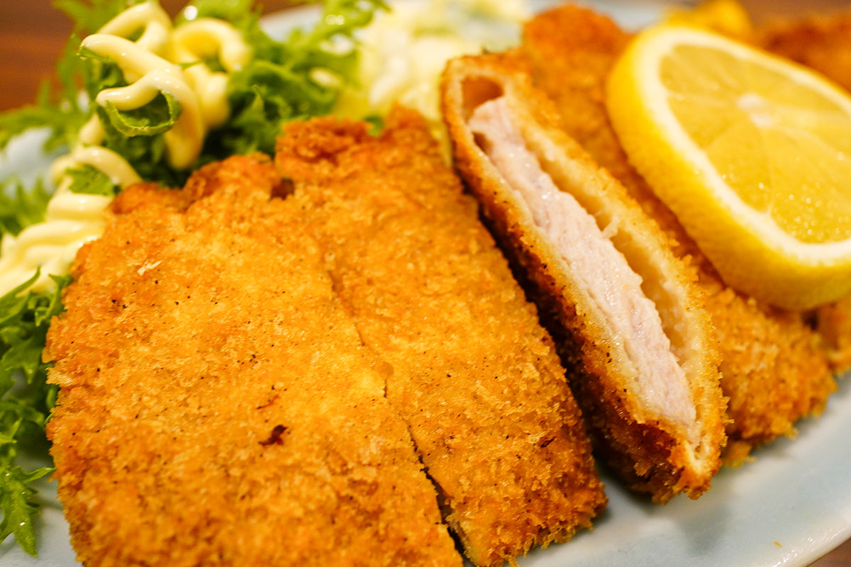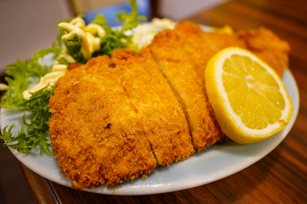 人気メニューのひとつが「とんかつ」。定食で750円という手頃さに加え、お皿に乗り切らないほどの大きさが嬉しい一品です。添えられた分厚いレモンにも感動!