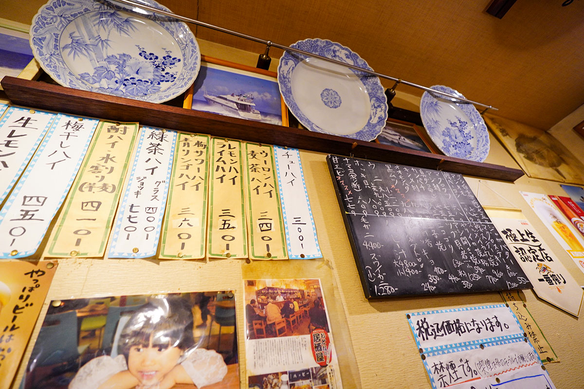 品書きは壁の黒板のみ。これは、その日足立市場で仕入れた一番良いものだけを出すという、実直な姿勢の表れ。今日はどんな美味しい魚に出会えるのかと、黒板を眺める時間も楽しみのひとつです。