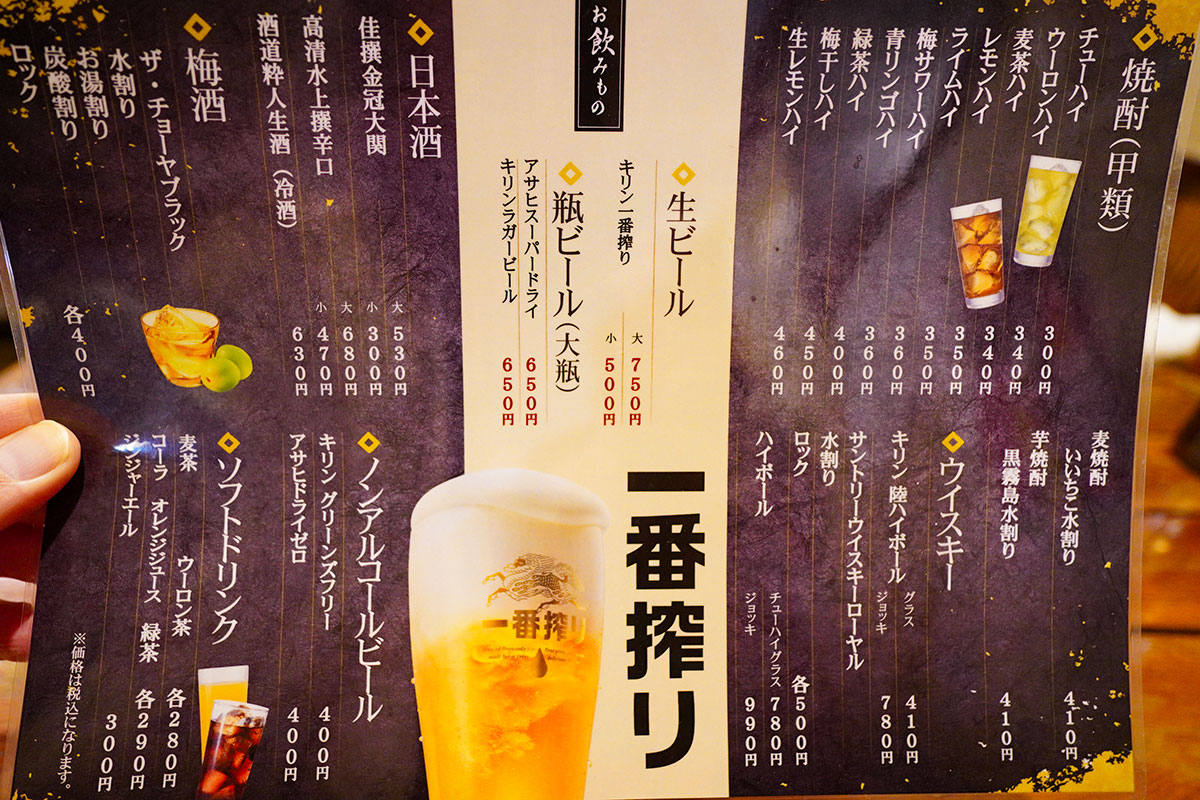 席につき、まずはキリンラガービールの大瓶をお願いしました。トクトクとグラスに注ぎ、しっかり冷えた一杯を喉に流し込む。これぞ酒場で過ごす休日の醍醐味。