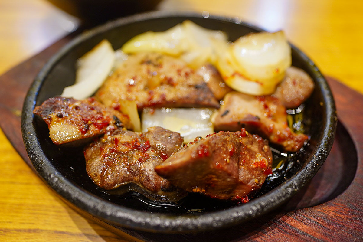 もうひとつの名物が鉄板焼。今回は「ごちゃもんホルモン焼」(429円)を注文しました。熱々の鉄板でジュージューと音を立てながら運ばれてきます。甘辛いタレが絡んだホルモンと玉ねぎは、ビールやサワーとの相性抜群です。