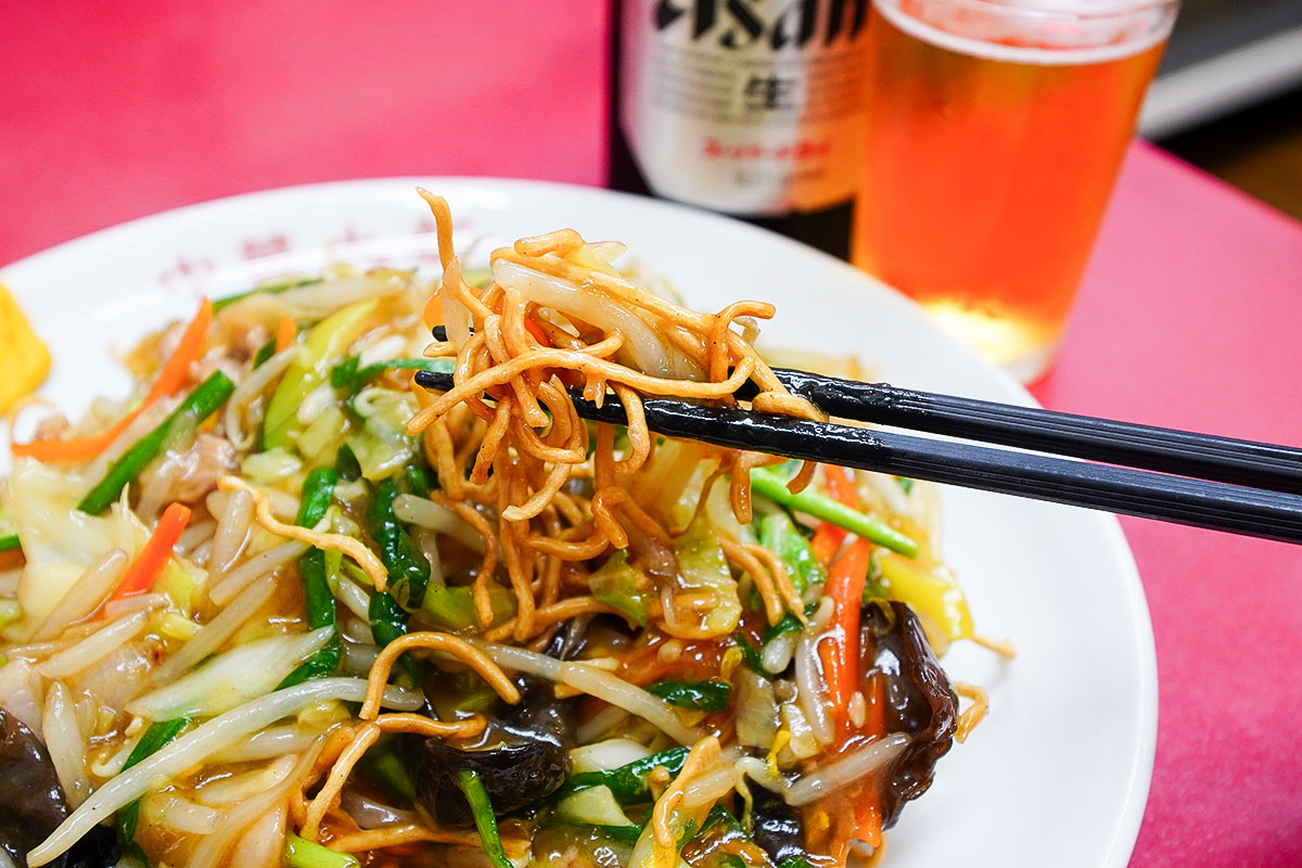 細麺はパリパリ。この食感がたまりません。あんかけが絡むとしんなりして、また違った美味しさが楽しめます。これはもう、立派なおつまみ。ビールがどんどん進みます。