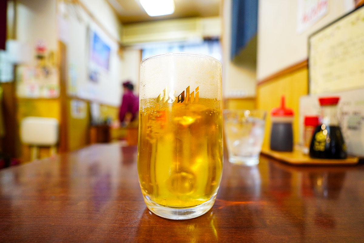 まずは樽生ビール(アサヒスーパードライ)をお願いして、喉を潤します。旅先で、しかもお昼から飲むビールの味はまた格別ですね。