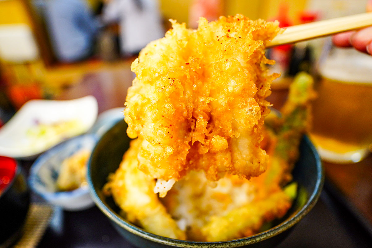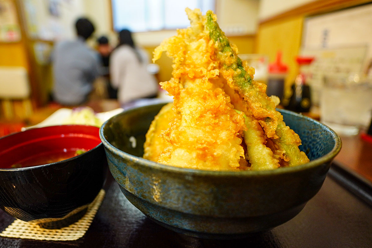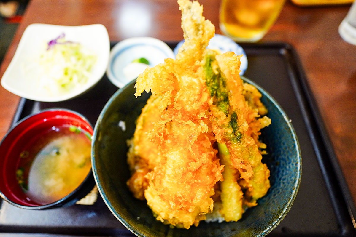 丼の中央から天高くそびえる長い穂先は、なんとアスパラガス。そして主役の大きな穴子の天ぷらが2本、丼からはみ出すように盛り付けられています。