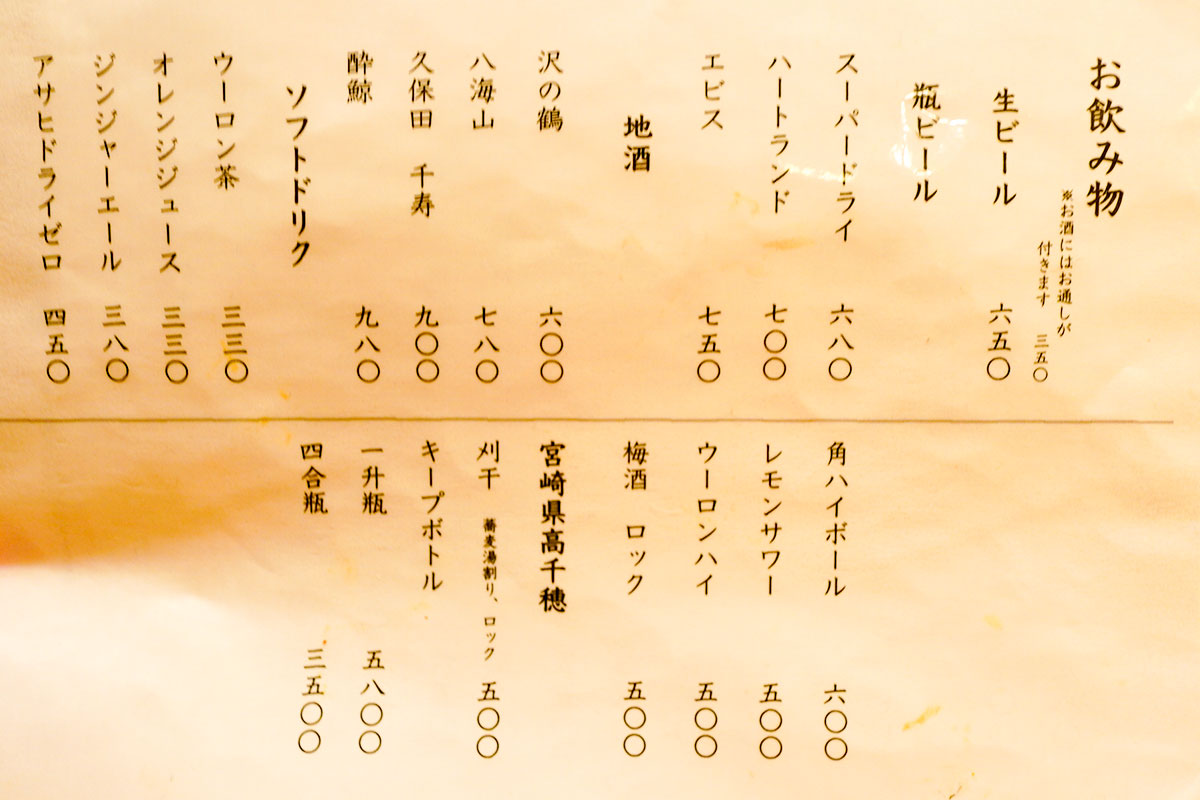 さて、席に着いてまずはビールをお願いしましょう。 ドリンクメニューを拝見すると、瓶ビール(スーパードライ 680円)の隣に「ハートランド(700円)」の文字が。蕎麦屋でハートランドを扱っているのは珍しいですね。