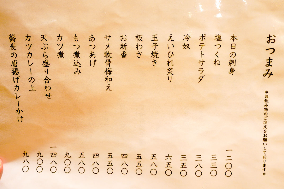 お酒をゆっくり楽しむための「おつまみ」も充実しています。「板わさ(450円)」や「玉子焼き(580円)」といった蕎麦屋の定番はもちろん、豊洲市場から直送されるという刺身まで揃っています。
