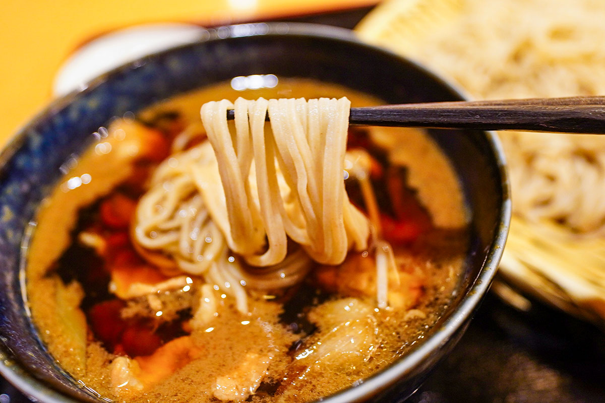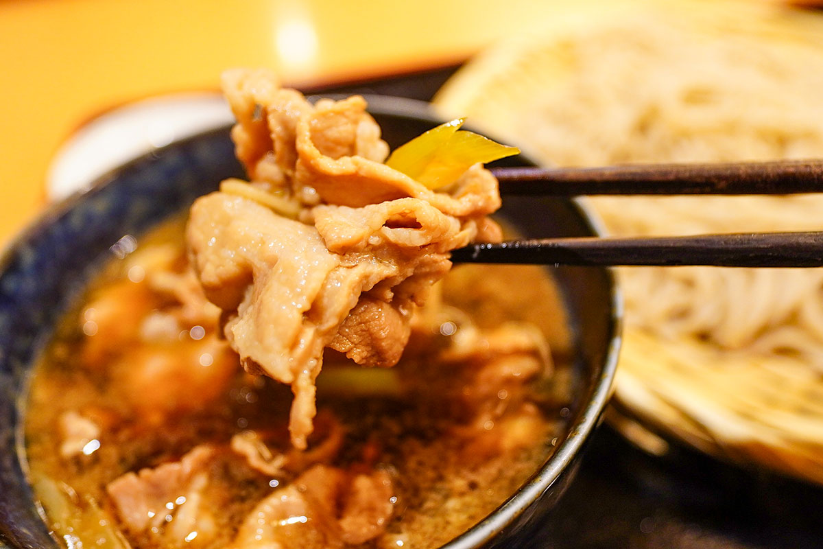 運ばれてきたつけ汁は、見るからに濃厚。レンゲですくうと、中からはたっぷりの豚肉が顔を出します。味わいは、東京らしい濃い目でちょっぴり甘め。これだけでも立派な酒の肴になります。