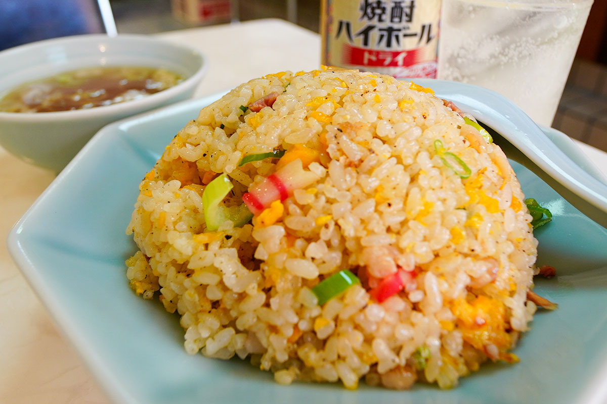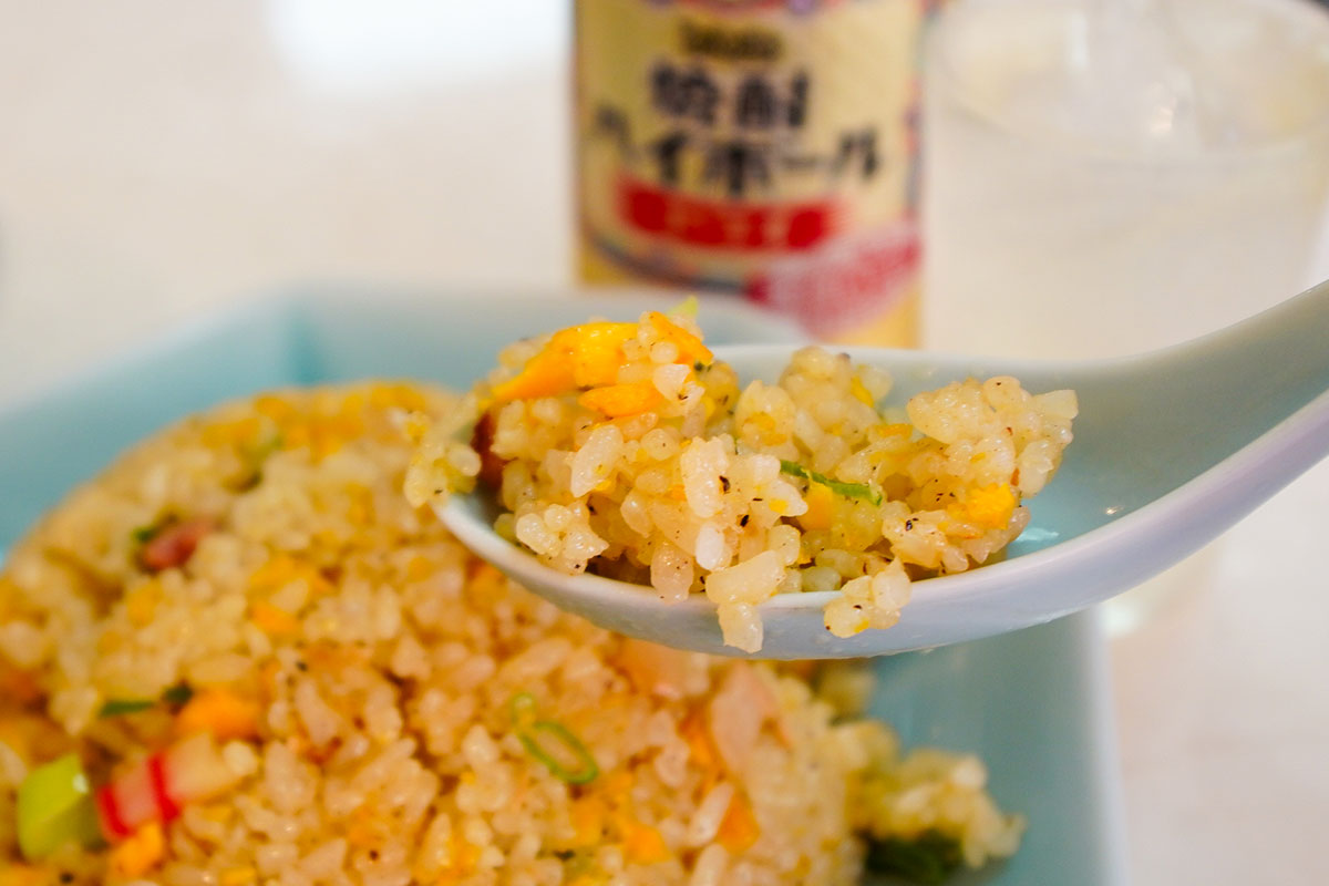 このチャーハンをつまみ、そこへぐっと宝の焼酎ハイボールを流し込む。たまにはこんな一軒目もいいですよね!