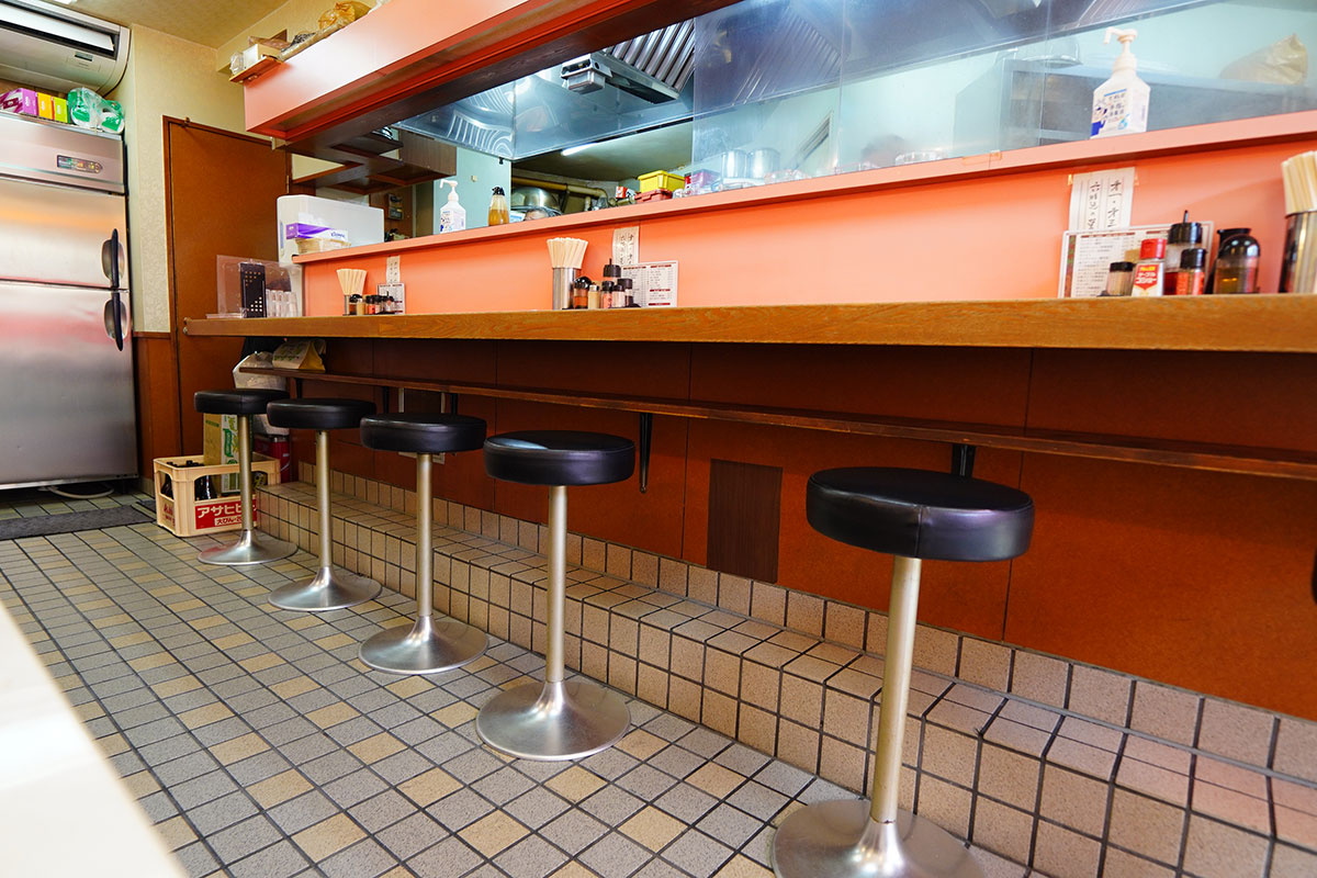 店内は朱色のカウンター席と、テーブルが並ぶコンパクトな造り。まさに「典型的な個人経営の中華屋さん」といった雰囲気です。この空間が落ち着くんですよね!