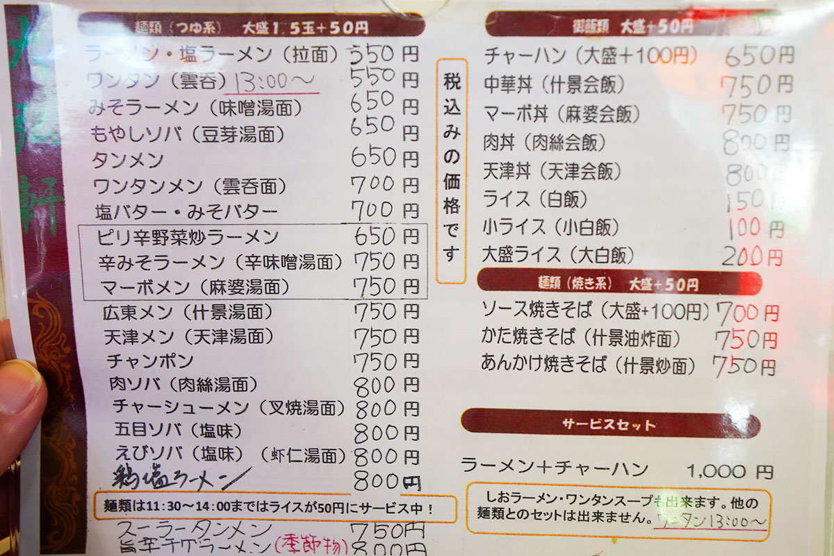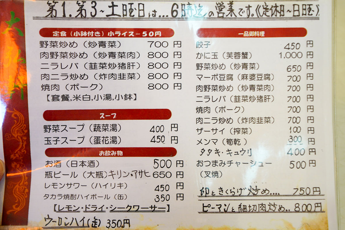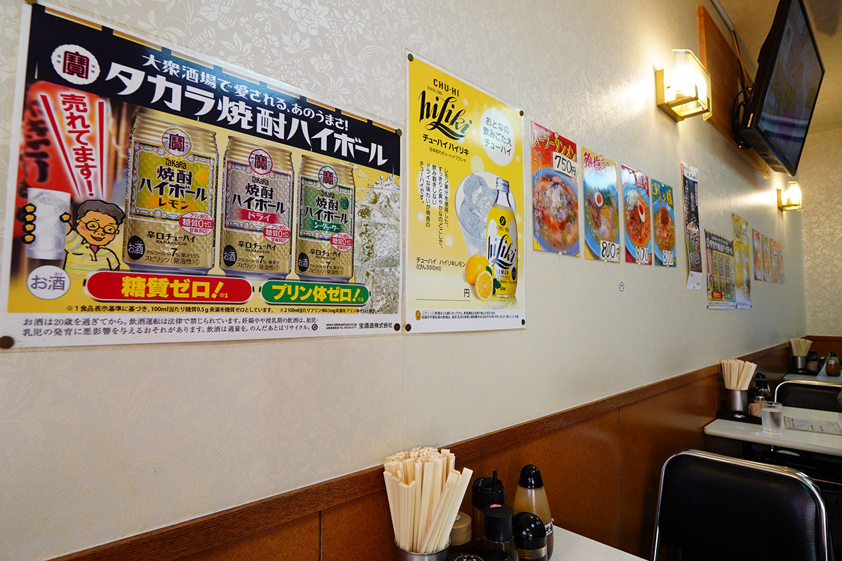 壁には麺飯類だけでなく、餃子やカニ玉、麻婆豆腐といった一品料理の張り紙が並びます。飲み物もビール、清酒に加えてレモンサワーまで揃っており、昼からの通し営業の「町中華飲み」スポットとしても利用可能。