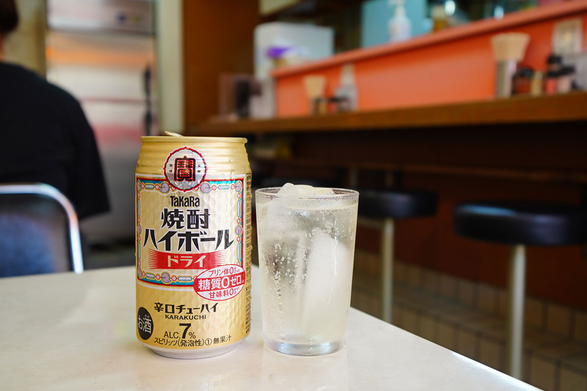 パイプ椅子に腰掛け、まずは缶入りの「宝焼酎ハイボール」をお願いしました。冷蔵庫から取り出された冷たい缶が、なんとも良い雰囲気です。グラスも用意してくれて、なによりロックアイスが入っているのが嬉しい!