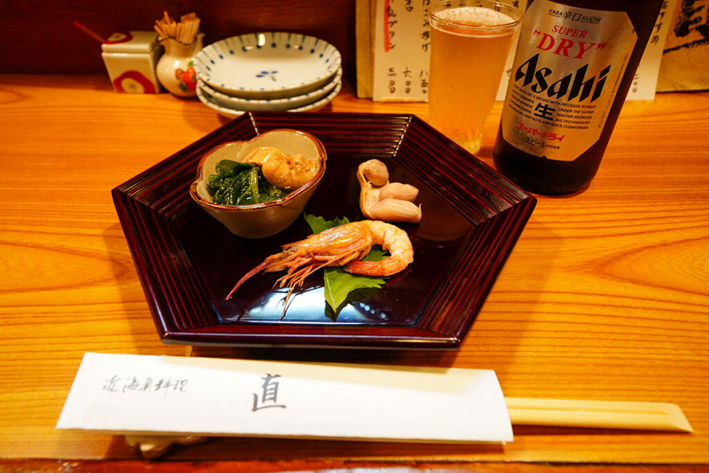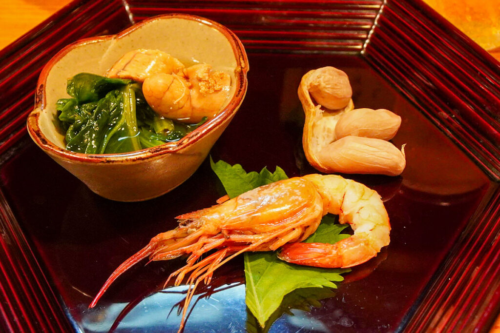 お通し(先付)が運ばれてきました。この日は、鯛の子、茹で落花生、そして海老の煮付け。 この一皿を見ただけで、ここが「当たり」の店だと確信しました。