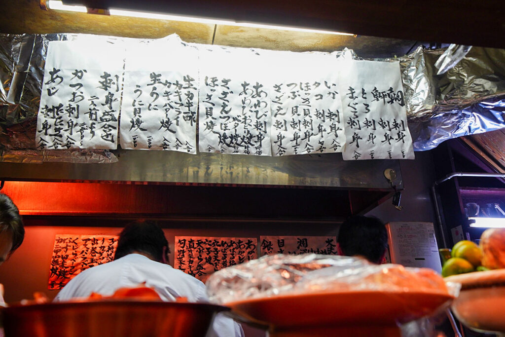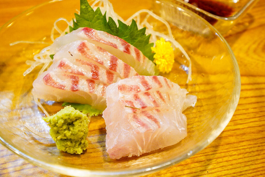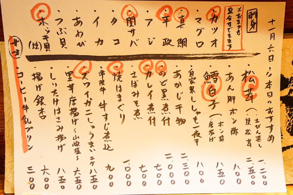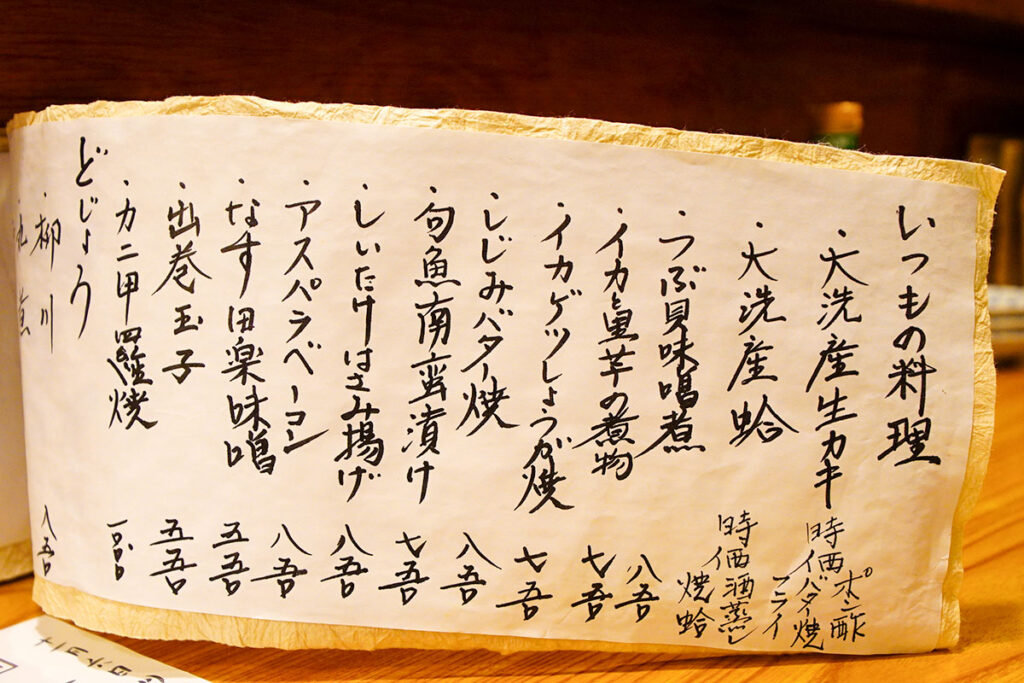 屋号に「近海料理」と掲げている以上、やはり刺身は外せません。 壁の短冊メニューには、水戸の魚の代表格であるカツオをはじめ、ヒラマサ、地物の牡蠣、つぶ貝など、常時10種類ほどの魚介が並んでいます。