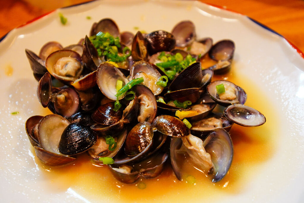しじみの酒蒸しとも炒めともつかない、濃厚な一皿。これが実にいい味を出しています。涸沼(ひぬま)など、茨城は良質なしじみの産地でもあります。身の濃い旨味が、お酒のピッチを加速させます。