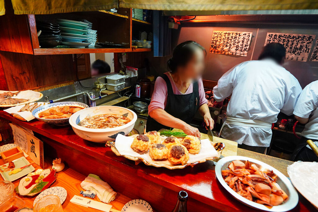 カウンターには大皿料理(おばんざい)がずらりと並んでいます。一夜干しのししゃも、肉厚のしいたけ包み揚げなど、どれも艶やかで美味しそう。これらを眺めながら何を頼もうか悩む時間は、カウンター飲みの特権です。