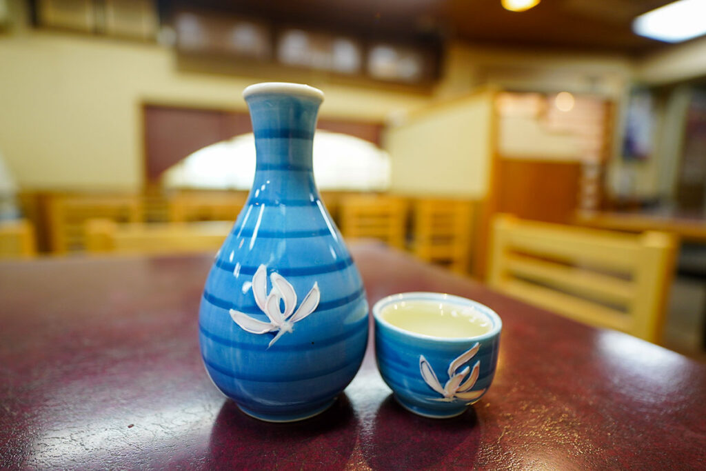 青い縞模様が美しい徳利とお猪口。温められたお酒が、散策で少し疲れた体に優しく染み渡ります。 お酒の肴には、板わさやそばみそといった「蕎麦前」の定番も揃っています。