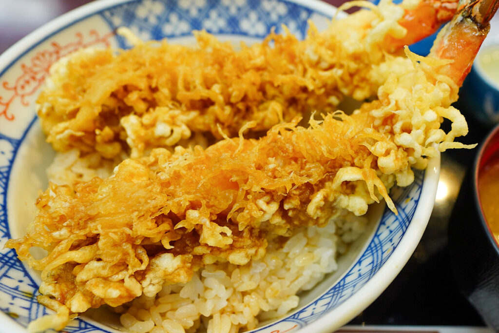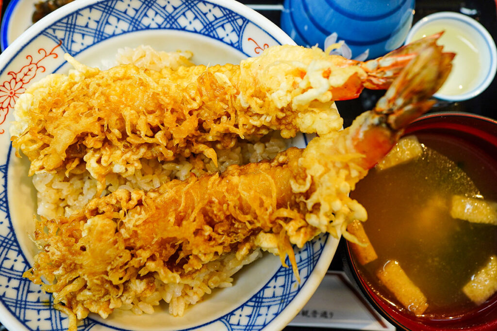 もちろん、北海道・音威子府(おといねっぷ)産の蕎麦粉を使ったお蕎麦も魅力的です。しかし、私のおすすめはあえての「天丼」。 野菜や魚がのるのではなく、大きな車海老が2本、どんと丼を埋め尽くすシンプルかつ豪快な一品です。