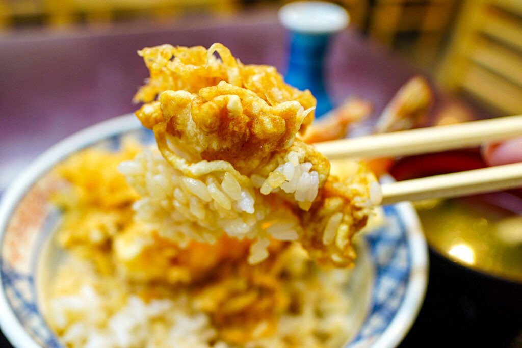 浅草界隈の天丼といえば、こってりとした黒い丼つゆをかけた「江戸前天丼」が主流ですが、満留賀のそれは蕎麦屋の天丼としての正統派。