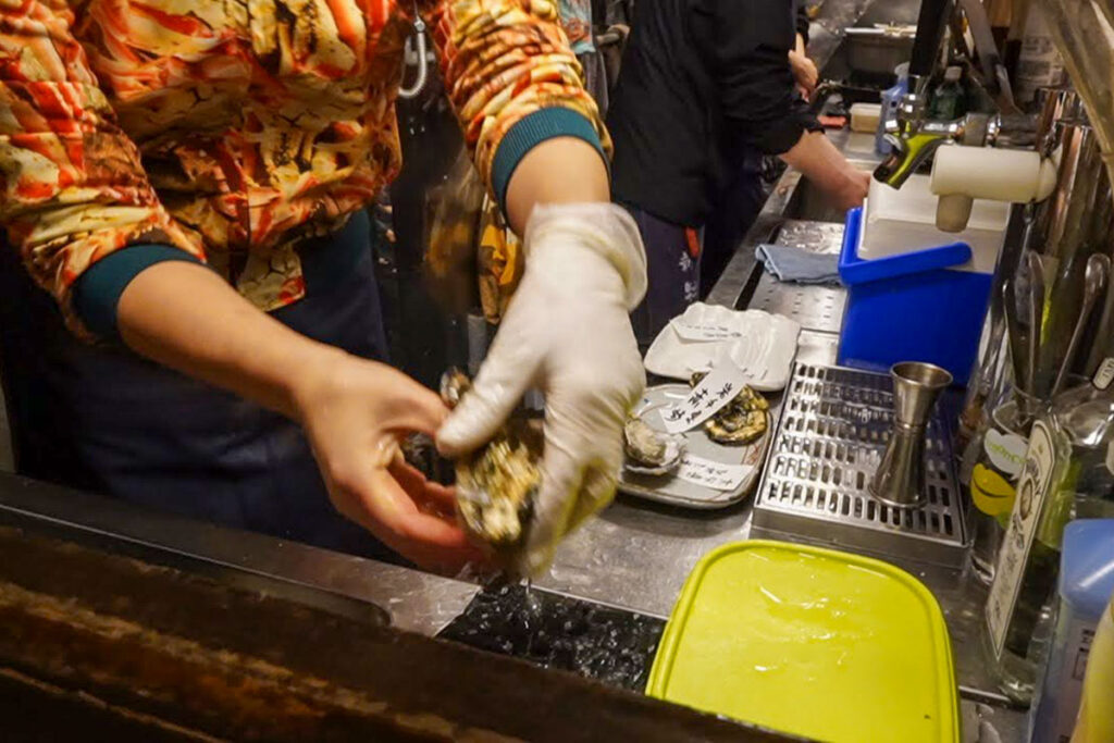 どれにするか迷う時間も楽しいのですが、今回は岩手県産の「赤崎」と、大分県産の「ひがた美人」を選びました。注文が入ると、目の前で手際よく殻を剥いてくれます。剥きたての瑞々しい姿を見るだけで、お酒が進みそうです。