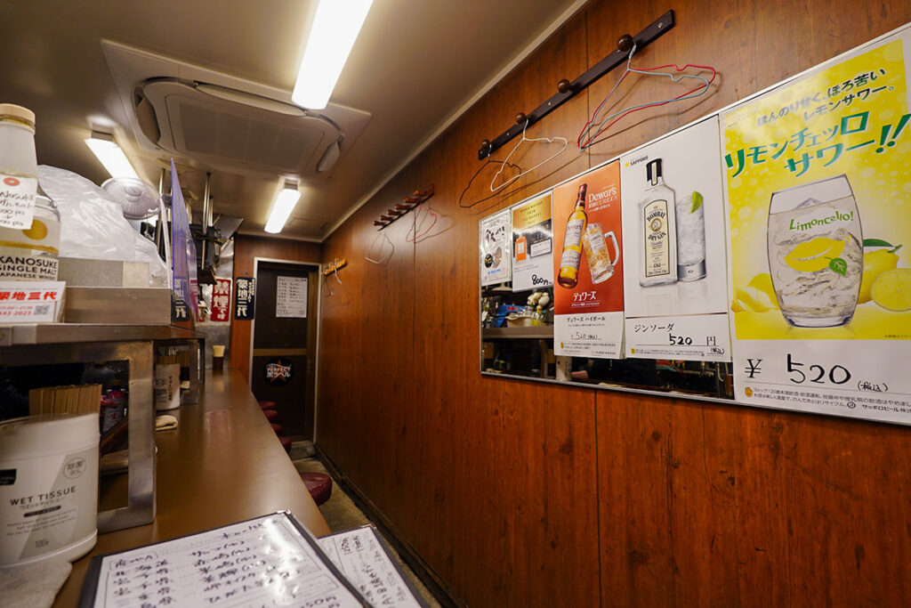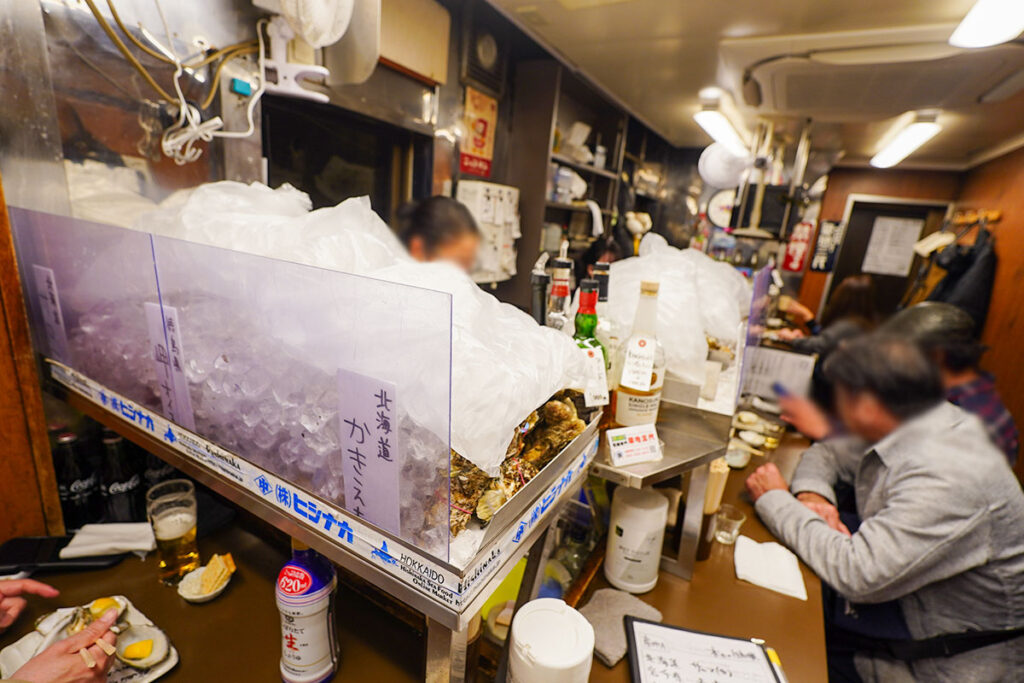 席はカウンターのみで、背中を通るのがやっとという狭さ。ですが、この距離感こそが横丁の醍醐味です。目の前のカウンター上には、かつてはお惣菜が並んでいたであろうスペースに、氷が敷き詰められ、立派な殻付き牡蠣が山のように積まれています。