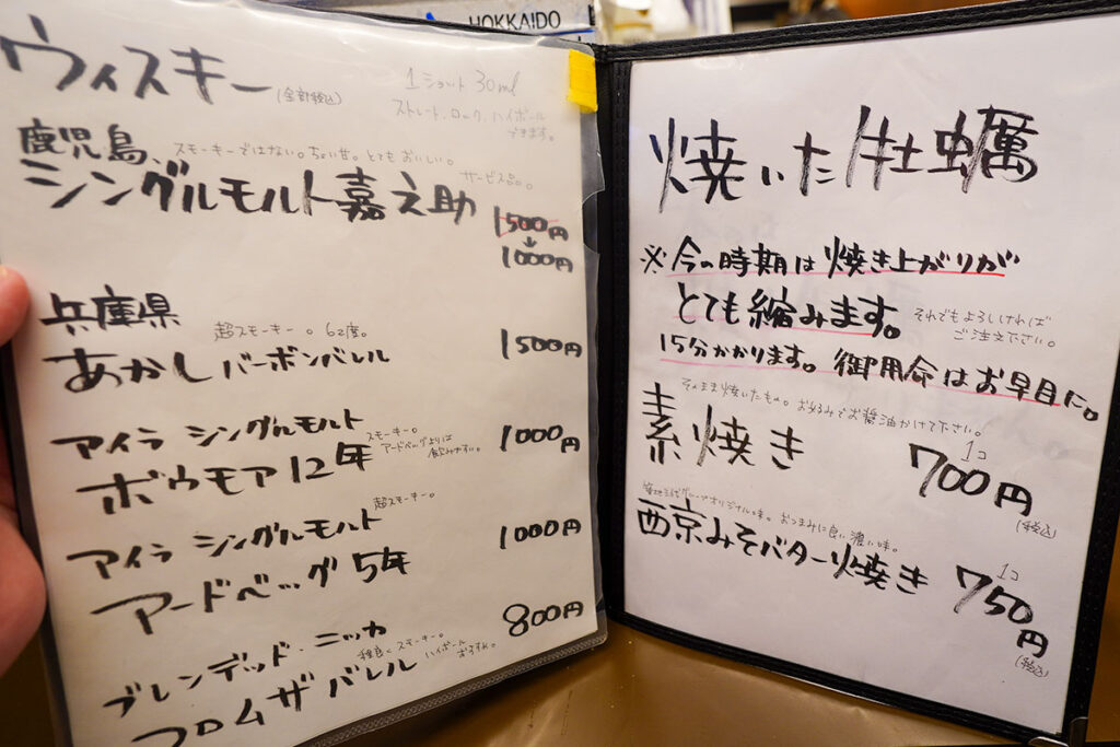 品書きには日本酒だけでなく、牡蠣に合うウイスキーもずらり。アイラモルトの「ボウモア」や、ニッカの「フロム・ザ・バレル」など、スモーキーな香りと潮の香りのマリアージュを楽しむのも乙なものです。