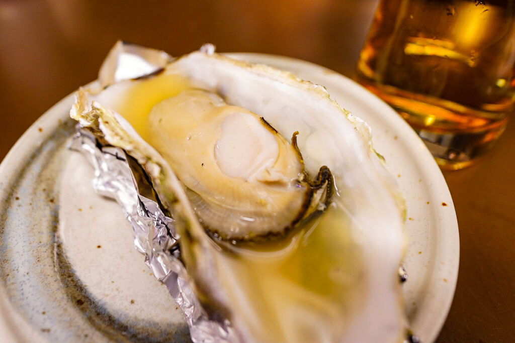 生牡蠣以外のおつまみは極限まで絞り込まれています。「素焼き」(700円)と「西京味噌バター焼き」(750円)の2種類のみ。素焼きをお願いすると、殻のまま焼かれた熱々の牡蠣が登場します。殻の中に溜まった熱々のスープ、これこそ最高の酒の肴。一滴も残さず飲み干せば、磯の香りが鼻腔を抜けていきます。