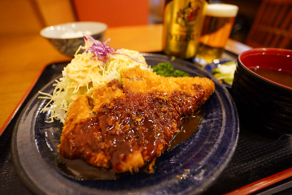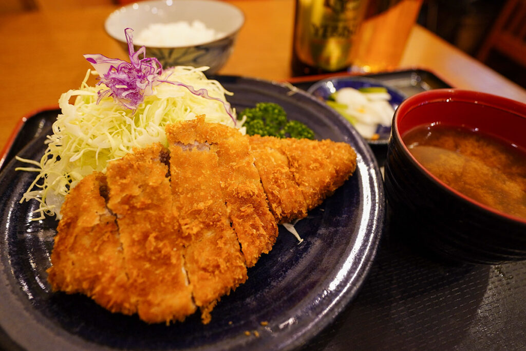 まずはヱビスビールの中瓶(700円)で乾杯。よく冷えたラガーの苦味が、仕事終わりの体に染み渡ります。カツ丼も人気ですが、今夜は王道の「ロースかつ定食 150g」(2,000円)をお願いしました。