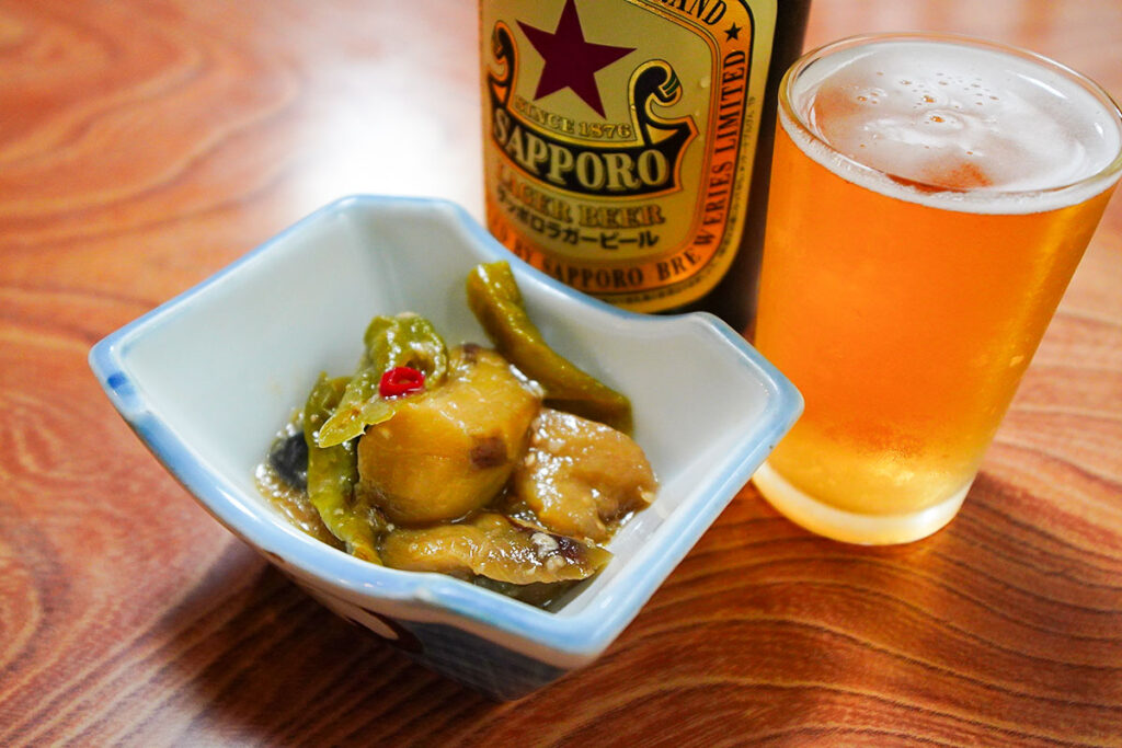 お通しはナスのピリ辛煮。クタクタに煮込まれたナスに醤油と唐辛子の味がしっかりと染みていて、これだけでビールが空いてしまいそうなほどの実力派。派手さはないもののしみじみ美味しい。それが山形の家庭料理なんです。