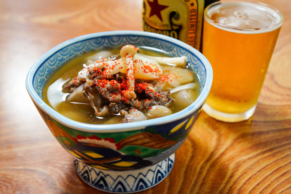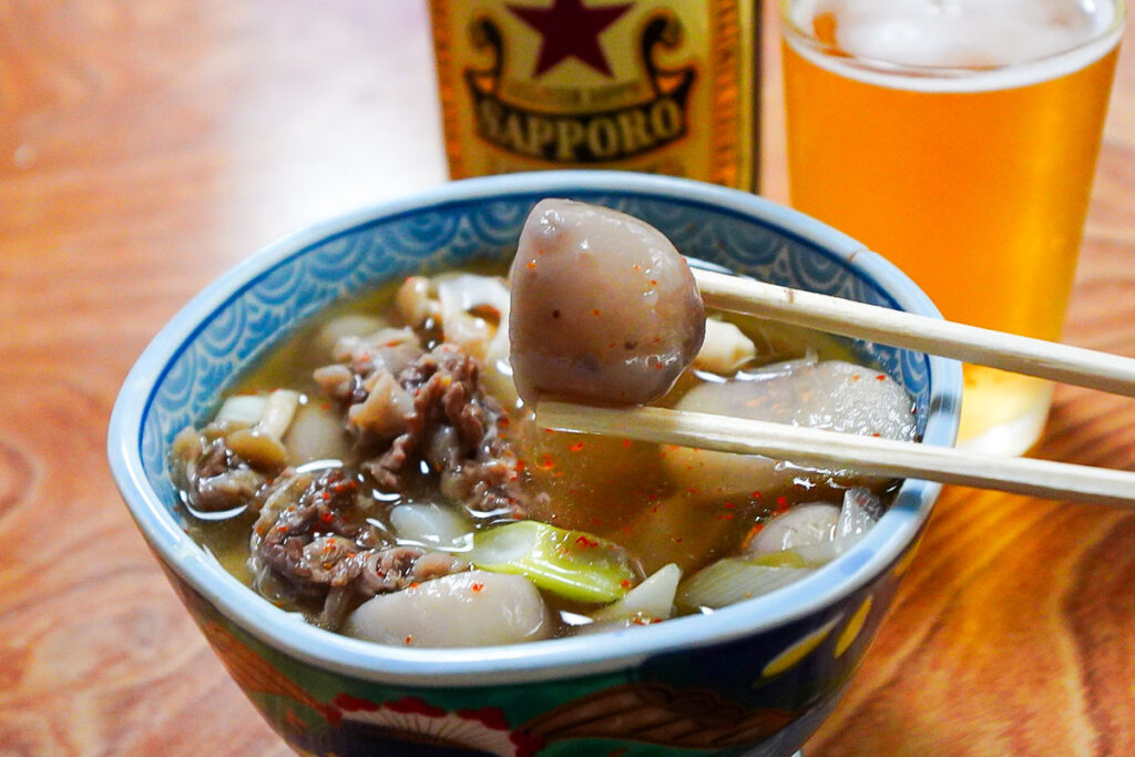 主役の里芋はねっとりと柔らかく、牛肉の脂の旨味と醤油のコクがスープに溶け出しています。こんにゃくやネギの食感も楽しく、体の中からじんわりと温まる美味しさ。ここで日本酒に切り替え、徳利を傾ける時間は至福そのものです。