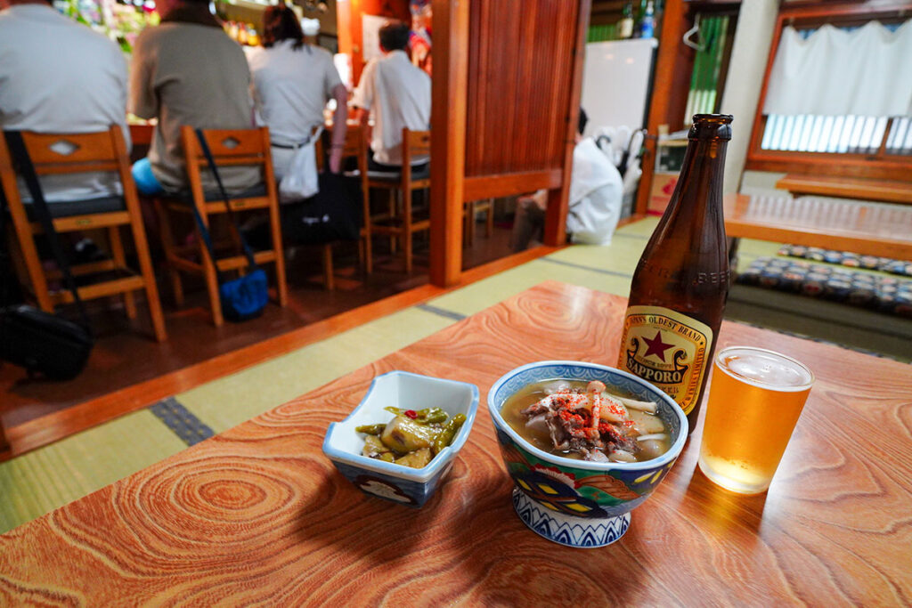 まずは瓶ビールをお願いします。出てきたのは、酒場好きには嬉しいサッポロラガー「赤星」。中瓶と昔ながらのビアタンが、この店の雰囲気にこれ以上なく馴染みます。