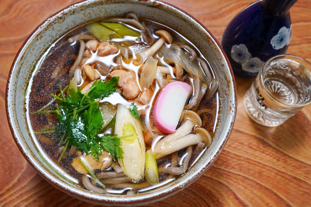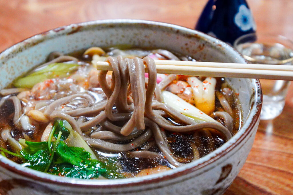 色が濃く太めの田舎そばは、しっかりとしたコシがあり、甘めのつゆとの相性が抜群。飲んだ後の体に、この滋味深い味わいが染み渡っていきます。