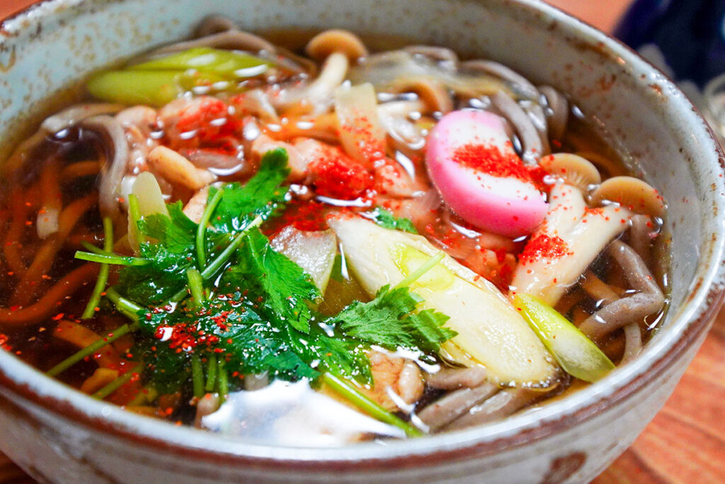 山形に来たからには、やはり「芋煮」は外せません。こちらでは内陸風の醤油味。注文が入ってから小鍋で仕上げてくれる芋煮からは、湯気とともに甘辛い醤油の良い香りが漂ってきます。