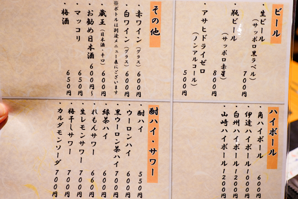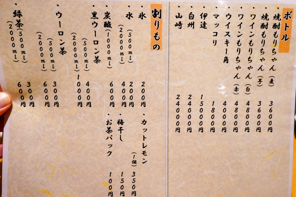 ドリンクメニューには「焼酎もりちゃん(麦・芋)3,600円」や「ワインもりちゃん(白・赤)4,800円」といったオリジナルボトルも。グループで訪れてボトルを入れるのも、この店の正しい楽しみ方かもしれません。