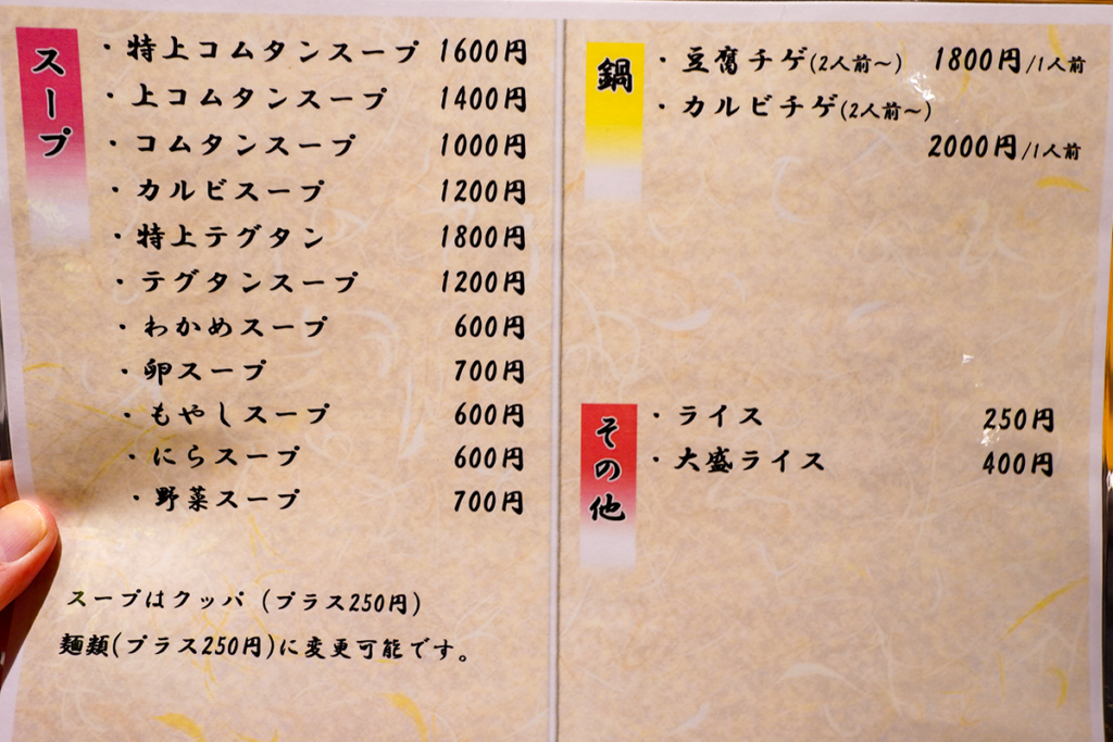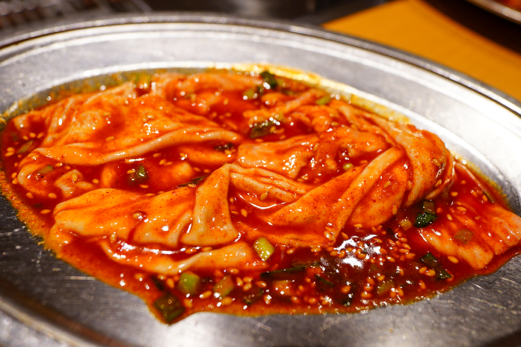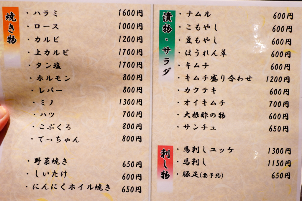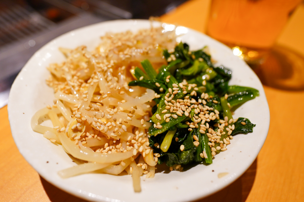 まずは「ナムル盛り合わせ(600円)」をつまみながら、メニューを吟味します。もやしとほうれん草のシンプルな味付けが、これからの肉への期待を高めてくれます。