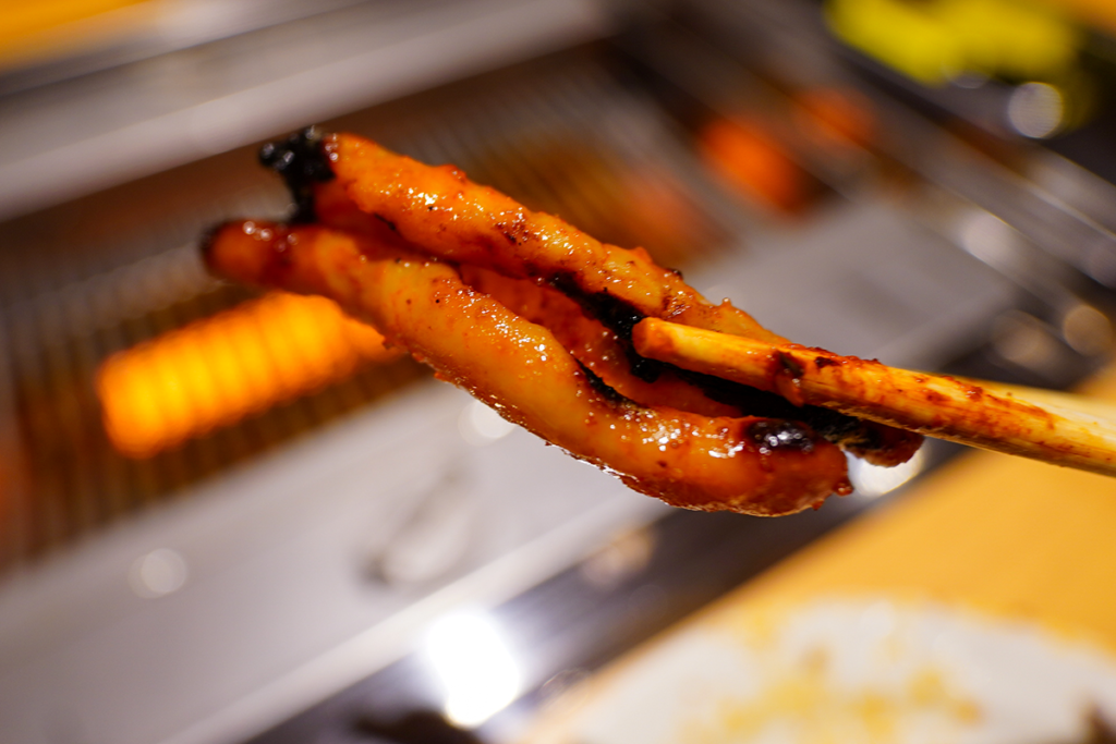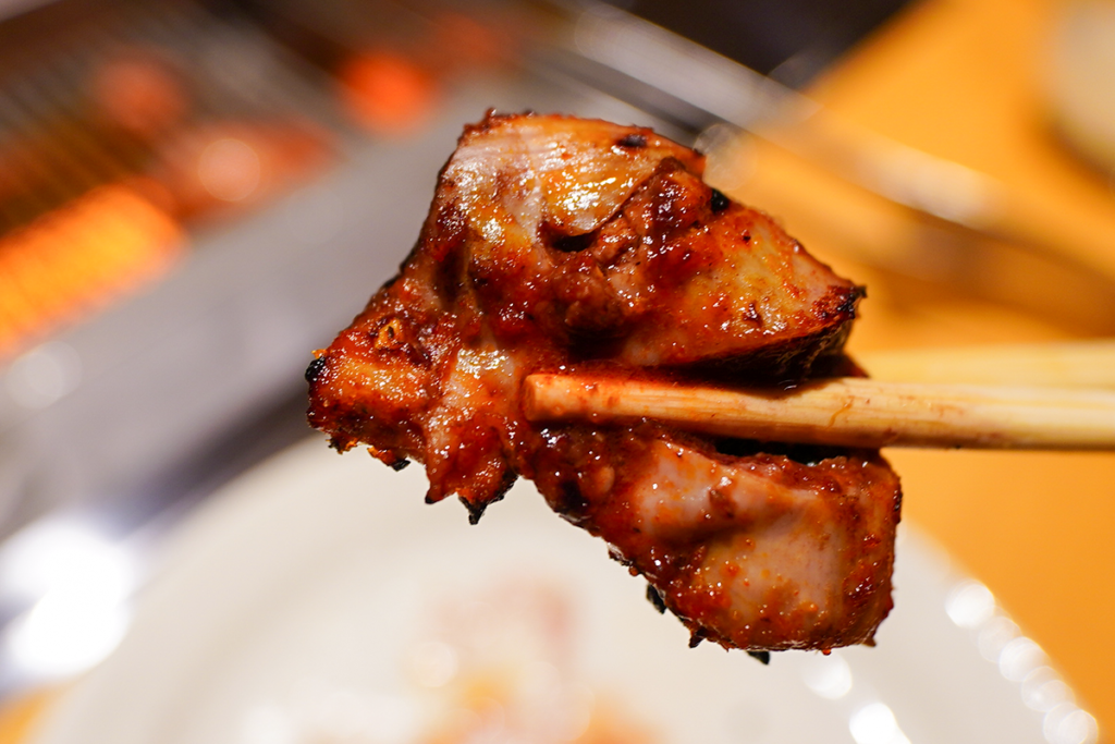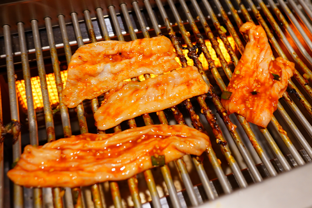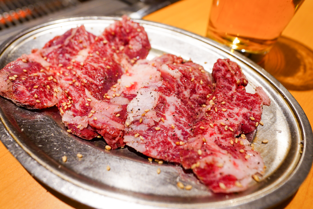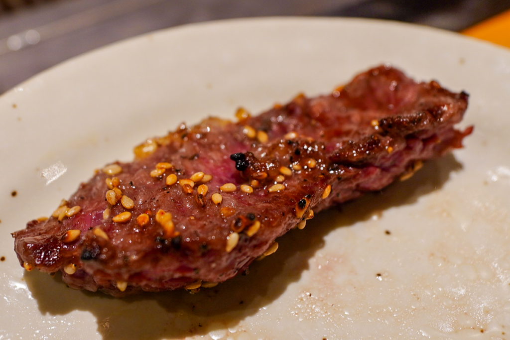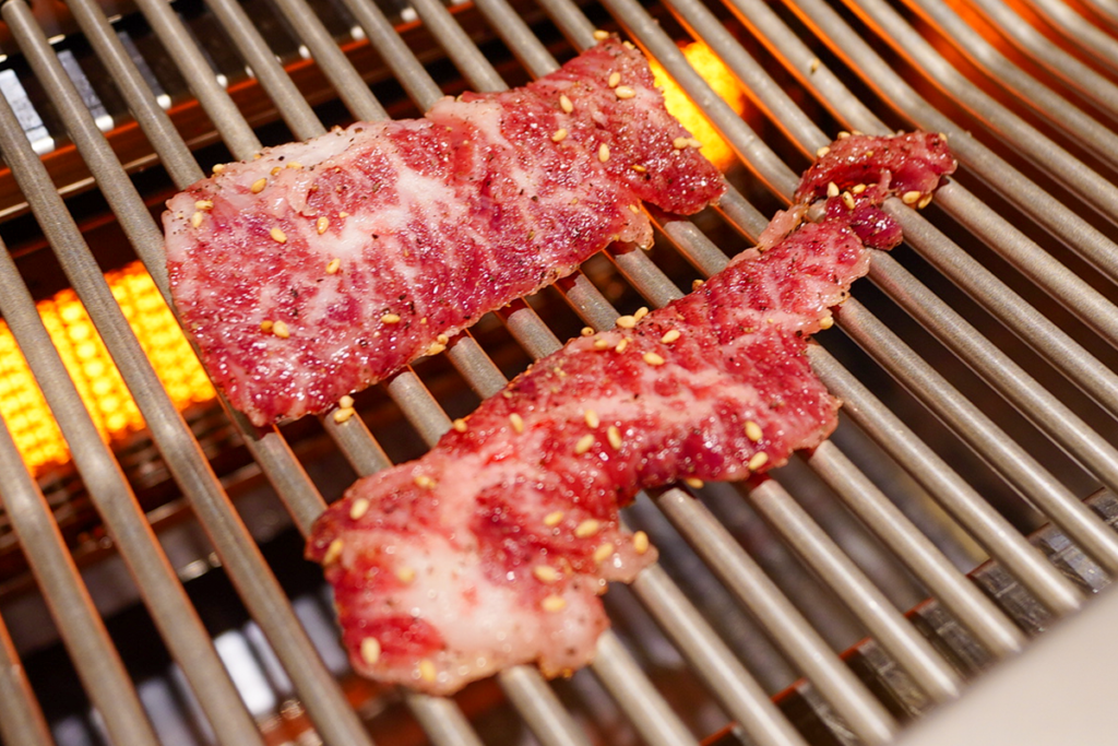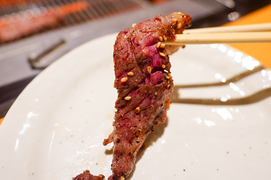 運ばれてきたハラミは、鮮やかな赤身に粗挽きの黒胡椒と白ごまが振られ、食欲をそそるビジュアル。網に乗せても無煙ロースターのおかげで煙に巻かれることなく、じっくりと焼き加減を見極められます。
