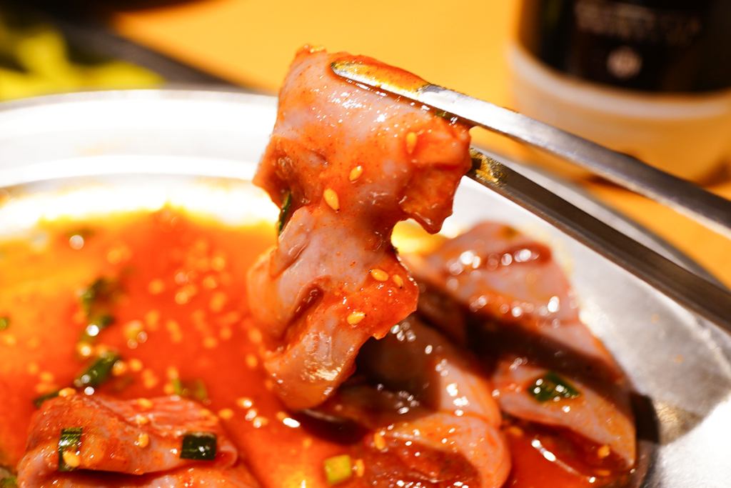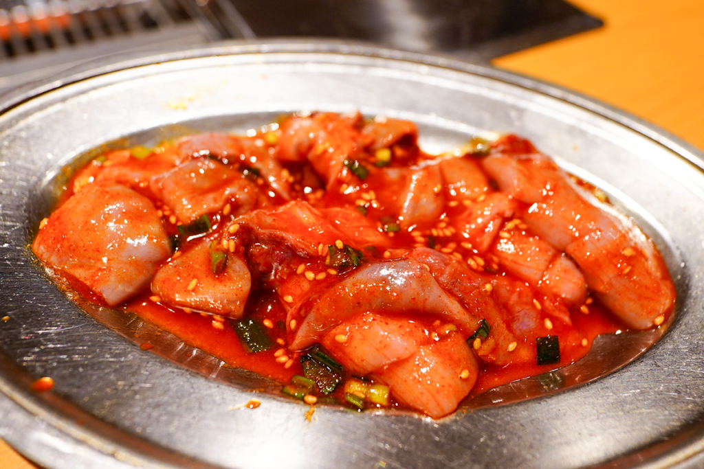 丁寧に下処理された淡いピンク色の身には、ピリ辛のタレがしっかりと絡んでいます。