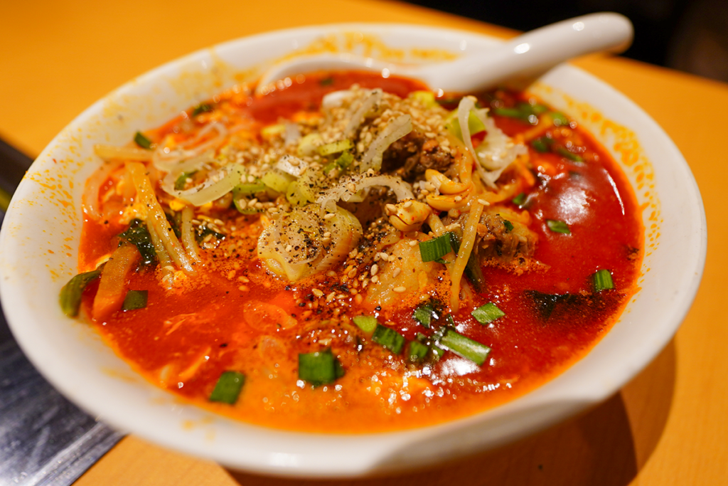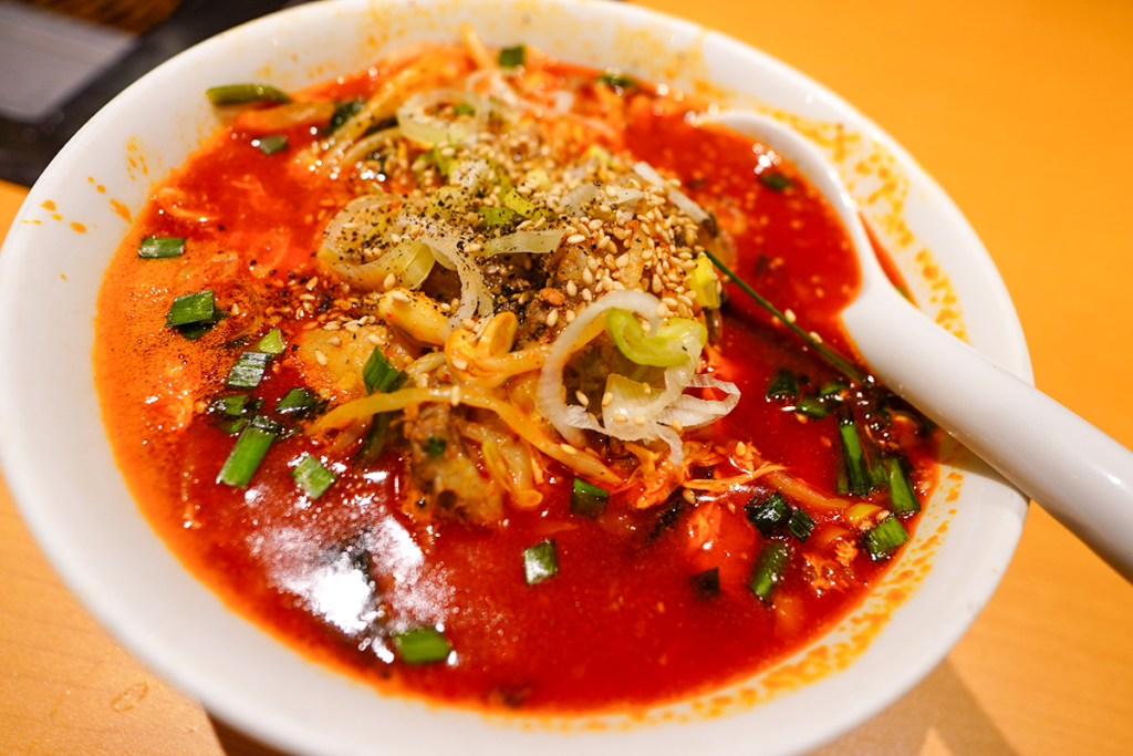 真っ赤に染まったスープが大きな丼で運ばれてきました。一見すると激辛スープのようですが、レンゲを入れるとズシリと重い手応えが。スープの中心から持ち上がってきたのは、たっぷりのネギとゴマをまとった、握りこぶし2つ分はある巨大な牛スネ肉の塊。