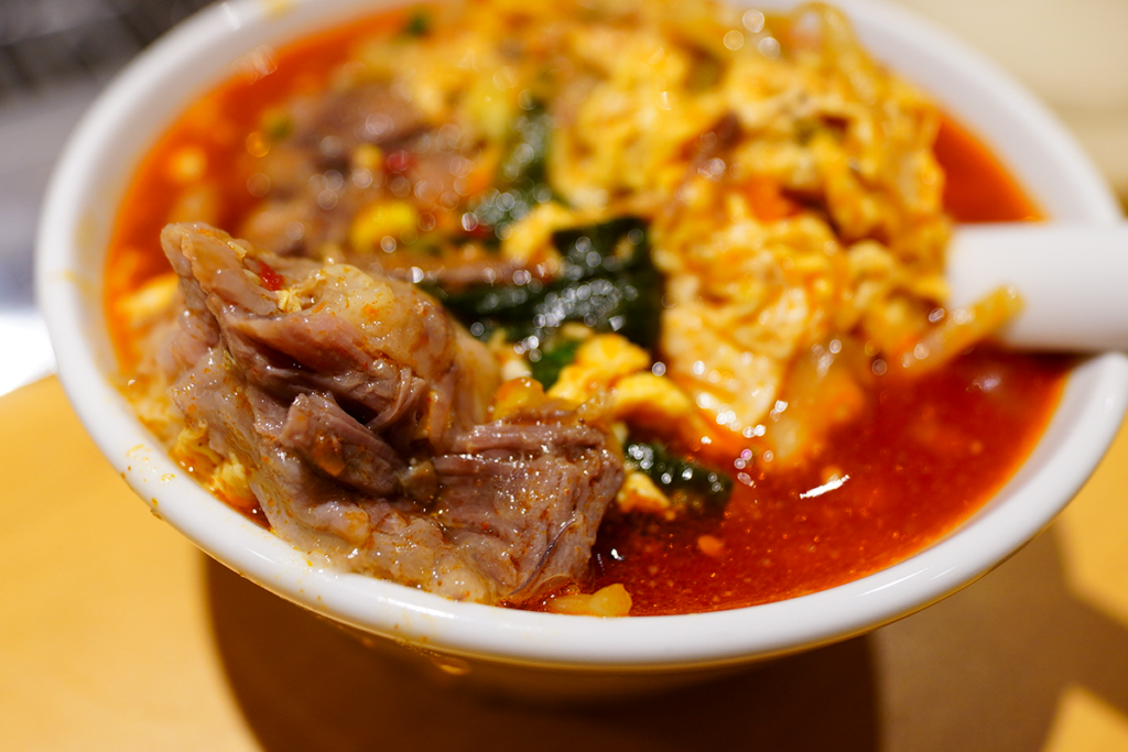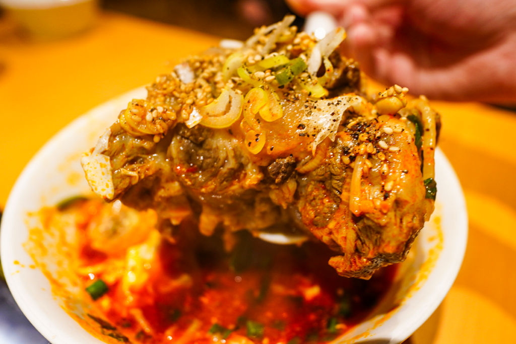 骨周りの肉を使っているため、煮込まれることでホロホロに柔らかくなっています。箸で崩しながらスープと一緒に啜ると、唐辛子の刺激の奥から、牛骨と肉の重厚な旨味が波のように押し寄せてきます。