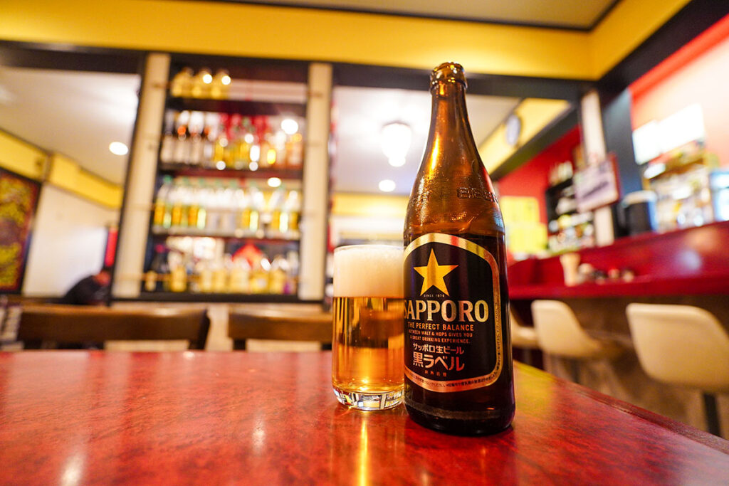 近くにサッポロビールの工場がある千葉県・湾岸エリア。やはりここはサッポロ黒ラベルを選びたいところ。瓶ビール(中瓶650円)をお願いして、まずは乾杯。よく冷えたビールが喉を潤します。