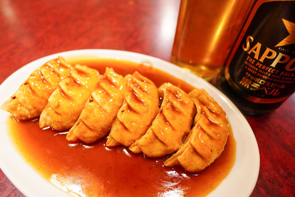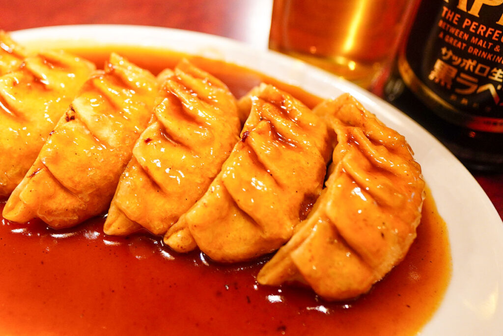 品書きを眺めると、麺類や飯類だけでなく、酒飲み心をくすぐる一品料理がずらり。なかでも常連さんたちがこぞって注文するのが「揚げ餃子甘酢タレ」(6個650円)です。