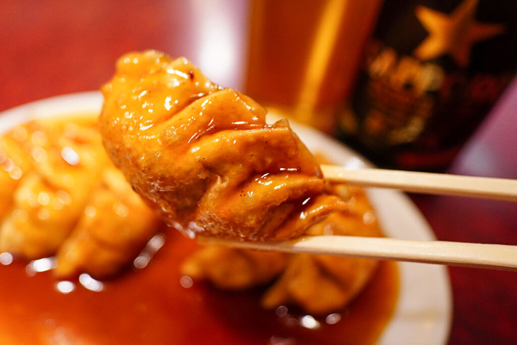 運ばれてきた瞬間、その艶やかな照りに目を奪われます。こんがりとキツネ色に揚がった大ぶりの餃子に、琥珀色の甘酢餡がとろり。