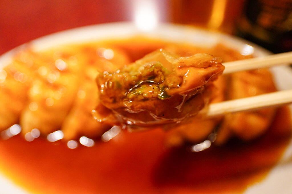 口に運べば、カリッとした皮の軽快な食感のあとに、餡が染みた部分がジュワッと解け、肉の旨味が広がります。
