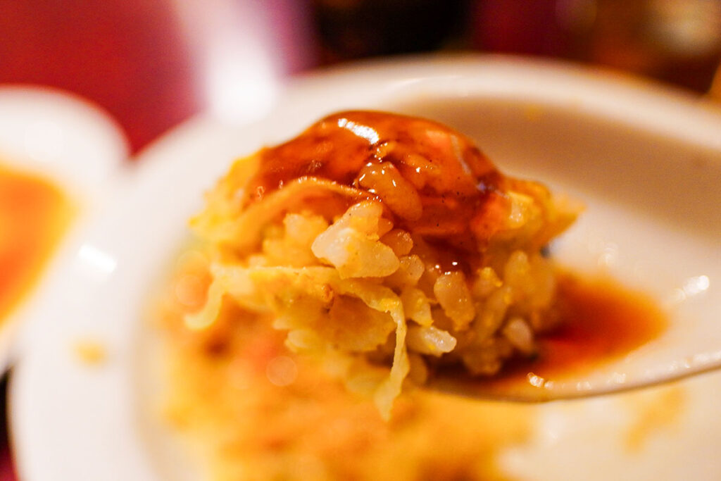先ほどの揚げ餃子の甘酢タレを少し炒飯にかけてみると、これまたいい感じ。中華はいろいろ混ぜると楽しい!
