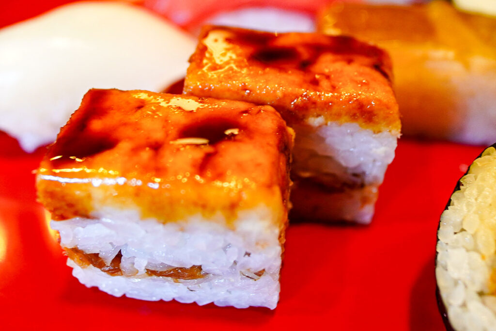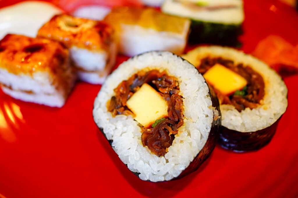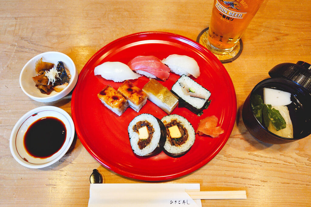 厚焼玉子を甘辛く炊いた椎茸や干瓢、三つ葉に海老そぼろもあわせて巻いた巻寿し。とくに椎茸が良い仕事をしており、完璧な酒の肴です。お酒を飲まずに食べるのはもったいないくらい。