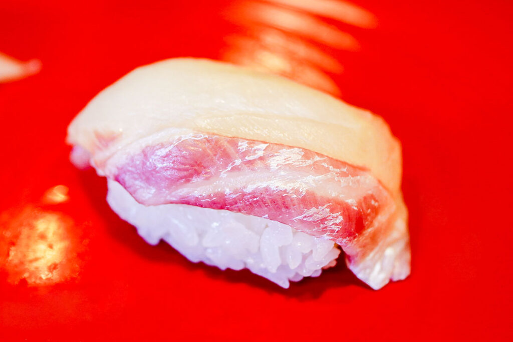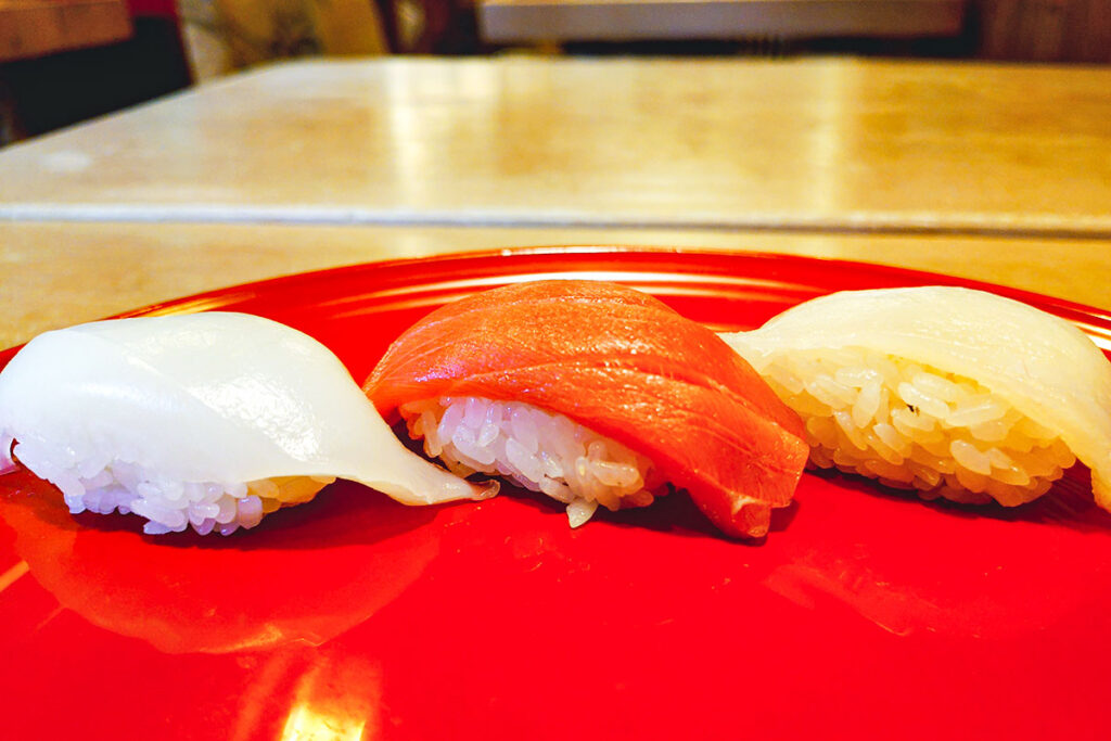 にぎりはマグロ、イカ、鯛の三貫。江戸前の握りよりも少し大きめのシャリが、ネタの存在感をしっかりと受け止めています。