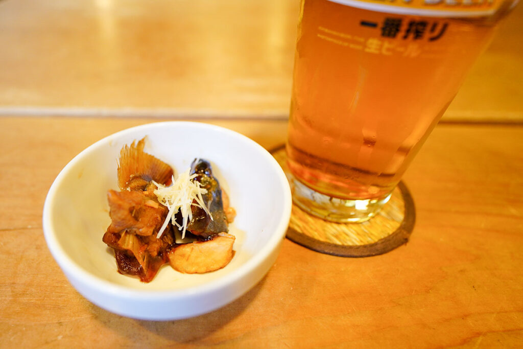 ここで嬉しい驚きがありました。ビールと共に運ばれてきた突き出しの小鉢です。魚のアラを甘辛く炊いたもので、骨周りの身の旨味と生姜の風味がたまりません。これだけでジョッキ半分は空いてしまいそう。