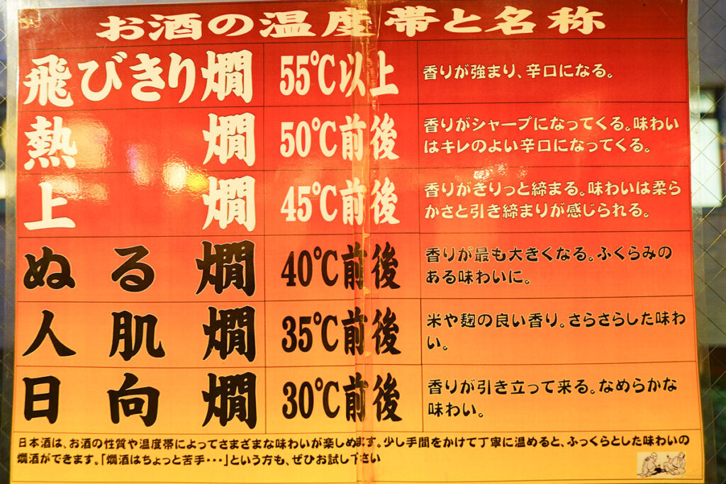 そして最後は、燗酒でゆるりと。さすがは酒のプロ、温度別でお燗の注文ができます。せっかくですから、熱燗以外の温度も試してみたくなりますよね。