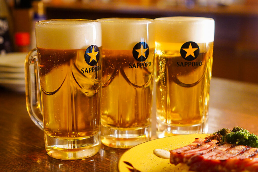 まずはビールで喉を潤しましょうか。ここで飲む「サッポロ生ビール黒ラベル」の樽生、ひと口飲んだ瞬間「えっ?」と驚くはずです。