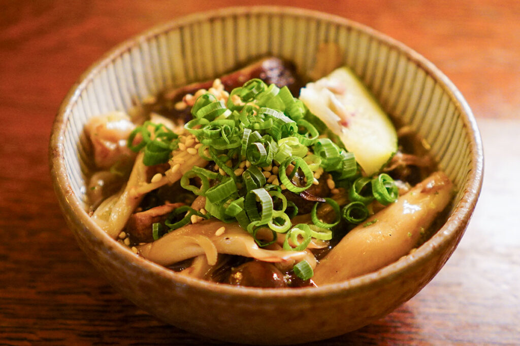 まずは「焼きキノコのおひたし」。香ばしく焼かれたキノコの旨味が出汁に染み出し、スタートに最適。