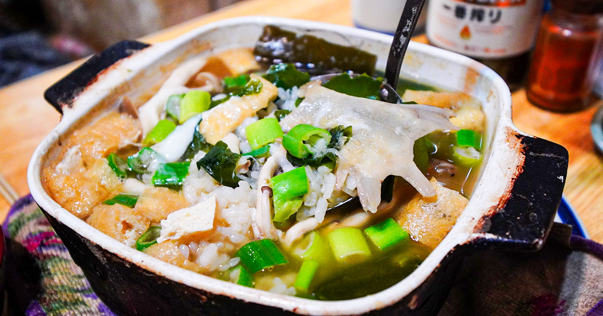 ふくよかな米の旨味が広がる熱燗をちびり。そこへ、セットの味噌汁が運ばれてきました。お椀からはみ出さんばかりの巨大な海老の頭が2つも入っています。海老の出汁が濃厚に溶け出した味噌汁は、五臓六腑に染み渡る深みのある味わい。ヨーロッパからの旅行者にも大評判だそうです。